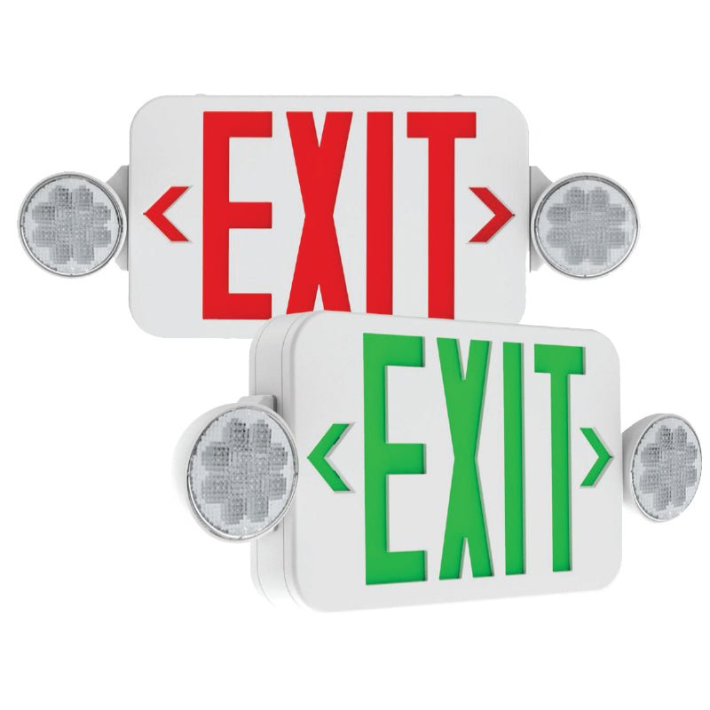 Barron Lighting QCRS-U-WH (2) 1.5w LED Two-Lamp Exit/Emergency Light Combo Fixture, Universal Red/Green Lettering, 120-277 Vp;t. 3.6v NiCad Batter, 90 Min EM run time, 6" Characters, Ceiling or Wall Mount, Snap-Put Feild Selectable Chevrons, T20 Rated, White Finish