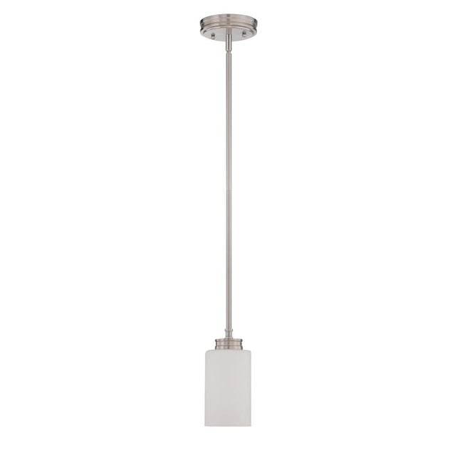 Sunset F18010-80-LED-JA8 1-Light Pendant Fixture, 4" x 52" tall, Ceiling Mount, White Opal Etched Glass, w/out 8W Max. Lamp, 3000K, 590 lumens, 50,000hr life, 120 volt, Dimming, Bright Satin Nickel Finish, Damp Location Rated *Discontinued*