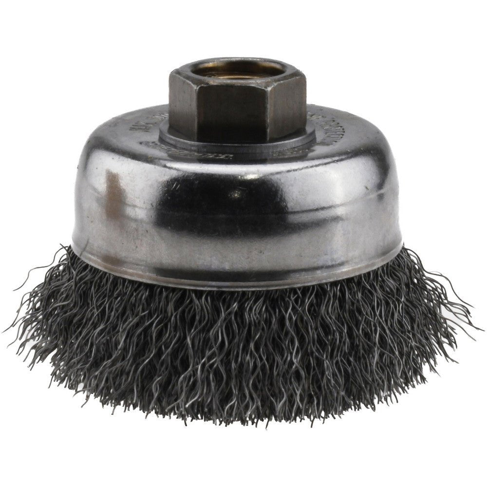 Weiler 93643 Cup Brush: 3" Dia, 0.0140" Wire Dia, Steel, Crimped 5/8-11, 1" Trim Length, 14000 Max RPM